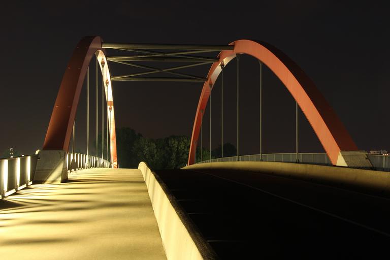 Keywords: industrial area port bridge steel structure illuminated germany night photograph