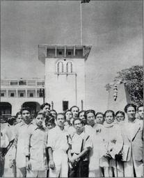 | Keywords: Infront of Kola Bhaban 21 Feb 1954.png  বাংলা ১৯৫৪ সালের ২১শে ফেব্রুয়ারি কলাভবন শ র্ষে কালো পতাকা উত্তোলনের পর কলাভবন প্রাঙ্গণে নির্মিত শহ দ স্মৃতিস্তম্ভের সামনে ভাষা আন্দোলনের কর্মিগণ ডান দিক থেকে আলাউদ্দিন আল-আ াদ আমানুল হক আহসানুল হক মূর্তা া বশ র  হ র রায়হান প্রমুখ ।<br>English 21st February 1954 Language Movement workers in front of foundation stone of the martyrs' monument at old arts faculty building premise after hosting black flag on top of the building From right Alauddin Al-Azad Amanul Hoque Ahsanul Hoque Murtaza Bashir Zahir Raihan others Author's Album 1954-02-21 Prof Rafiqul Islam PD-Pakistan GFDL cc-by-3 0 Photos by Rafiqul Islam |