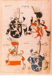 | Keywords: Ingeram Codex 010.jpg  Ingeram-Codex der ehemaligen Bibliothek Cotta <br/>Eckartzaw Eckartsau <br/> Eberßdorff <br/> Puchaim Puchheim <br/> Rerrer Die Wappenbücher Herzog Albrechts VI von Österreich Ingeram-Codex d ehem Bibliothek Cotta; hrsg v Charlotte Becher u Ortwin Gamber; Wien; Köln; Graz; 1986 Jahrbuch der Heraldisch-Genealogischen Gesellschaft Adler; Folge 3 Bd 12 Jg 1984/85; ISBN 3-205-05002-9 1459 Hans Ingeram and a so called Exempla-master Reproduction of a painting that is in the public domain because of its age PD-old-100 Ingeram - Österreichischer Adel Argent a fess gules Argent and gules in heraldry Coats of arms of Puchaim family Coats of arms of Ebersdorf family Eberssdorff Ingeram Codex Unicorns in Ingeram Codex 010 2 Eberssdorff |