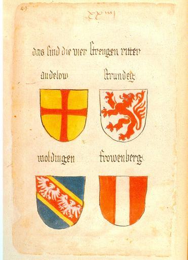 | Keywords: Ingeram Codex 049.jpg Ingeram-Codex der ehemaligen Bibliothek Cotta <br/> XXiiij <br/> das sind die vier strengen ritter <br/> andelow <br/> strundeg <br/> moldingen <br/> frowenberg Die Wappenbücher Herzog Albrechts VI von Österreich Ingeram-Codex d ehem Bibliothek Cotta; hrsg v Charlotte Becher u Ortwin Gamber; Wien; Köln; Graz; 1986 Jahrbuch der Heraldisch-Genealogischen Gesellschaft Adler; Folge 3 Bd 12 Jg 1984/85; ISBN 3-205-05002-9 1459 Hans Ingeram and a so called Exempla-master Reproduction of a painting that is in the public domain because of its age PD-old-100 ImageNote 1 112 147 402 65 675 931 2 das sind die vier strengen ritter ImageNoteEnd 1 ImageNote 2 143 248 107 42 675 931 2 andelow ImageNoteEnd 2 ImageNote 3 366 237 126 64 675 931 2 strundeg ImageNoteEnd 3 ImageNote 4 129 535 143 61 675 931 2 moldingen ImageNoteEnd 4 ImageNote 5 349 532 174 62 675 931 2 frowenberg ImageNoteEnd 5 Exempla Meister-Reichsverfassung Coats of arms of Andlau family Gules a pale argent Coats of arms of Fraunberg family |