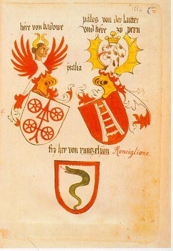 | Keywords: Ingeram Codex 076.jpg Ingeram-Codex der ehemaligen Bibliothek Cotta <br/> Telp <br/> here von badowe Francesco Carrara Herr von Padua +1405 <br/> pa u lus von der laitter/ und here zu pern Paolo della Scala Herr von Verona + um 1440 <br/> ytalia/fry her von runzelyon <br/> Ronciglione Anguillara Freiherr von Ronciglione Die Wappenbücher Herzog Albrechts VI von Österreich Ingeram-Codex d ehem Bibliothek Cotta; hrsg v Charlotte Becher u Ortwin Gamber; Wien; Köln; Graz; 1986 Jahrbuch der Heraldisch-Genealogischen Gesellschaft Adler; Folge 3 Bd 12 Jg 1984/85; ISBN 3-205-05002-9 1459 Hans Ingeram and a so called Exempla-master Reproduction of a painting that is in the public domain because of its age PD-old-100 Exempla Meister-Fremde Herrschaften Historical images of Ronciglione Coats of arms of the House of della Scala Padua in art Bordures gules |