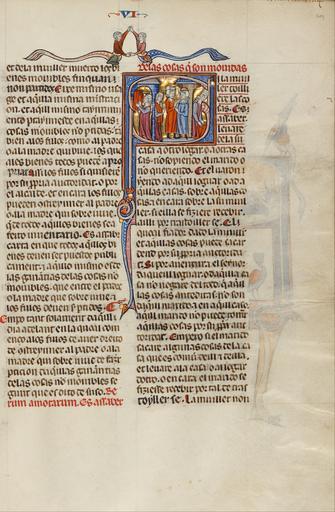 | Keywords: Initial S- A Woman Leaving Her Husband's House - Google Art Project.jpg This historiated initial S opens a chapter dealing with the rights of a husband or wife to household property A woman leaves her husband taking with her a curtain She appears three times removing the red drape at the left then exiting the house and finally leaning over the drape in her new home at the far right According to the text if a woman leaves her husband he has the legal right to take back both her and his possessions In the center of the composition the abandoned husband accompanied by a bondsman speaks to the head of the woman's new household about reclaiming his property The artist astutely used color to make associations among the characters The husband's clothing and his property are red while the other man is shown in blue The wife wears both colors indicating her conflicted legal status A woman of the Middle Ages spent much of her life under the guardianship of a man first her father and then her husband severely limiting her personal legal rights and economic power None 430703 Unknown /collection/the-j-paul-getty-museum/artwork/initial-s-a-woman-leaving-her-husbands-house-unknown/6835154/ Unknown illuminator /collection/the-j-paul-getty-museum/ The J Paul Getty Museum 343005 http //www getty edu/museum 3/12/2012 4 47 55 PM /collection/the-j-paul-getty-museum/artwork/initial-s-a-woman-leaving-her-husbands-house-unknown/6835154/ 1290 about 1290 - 1310 Law and Politics Tempera colors gold leaf and ink on parchment 365 6835154 True 1310 3/25/2012 12 53 18 PM lido getty edu-gm-obj5197 http //www getty edu/art/gettyguide/artObjectDetails artobj 5197 http //www getty edu/legal/copyright html Folio 1290 1320 Spain Creation w240 x h365 cm about 1290 - 1310 False 0 654296875 Part initial-s-a-woman-leaving-her-husbands-house-unknown Initial S A Woman Leaving Her Husband's House i 240 Tempera colors gold leaf and ink on parchment Law and Politics http //www getty edu/legal/copyright html special url_id dwESCB4XDIyMuw PD-old-100 Google Art Project works by unknown artist MS LUDWIG XIV 6 Getty museum - Vidal Mayor S as an initial |