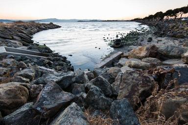 Keywords: outdoor rock rock formation This view at Eastshore State Park shows a rocky outcrop jutting into the bay at left, and a tree-lined shore at right, coming together near drainage pipes (the cement structures). The sun is setting and tires can be seen on the beach. This view at Eastshore State Park shows a rocky outcrop jutting into the bay at left, and a tree-lined shore at right, coming together near drainage pipes (the cement structures). The sun is setting and tires can be seen on the beach. |