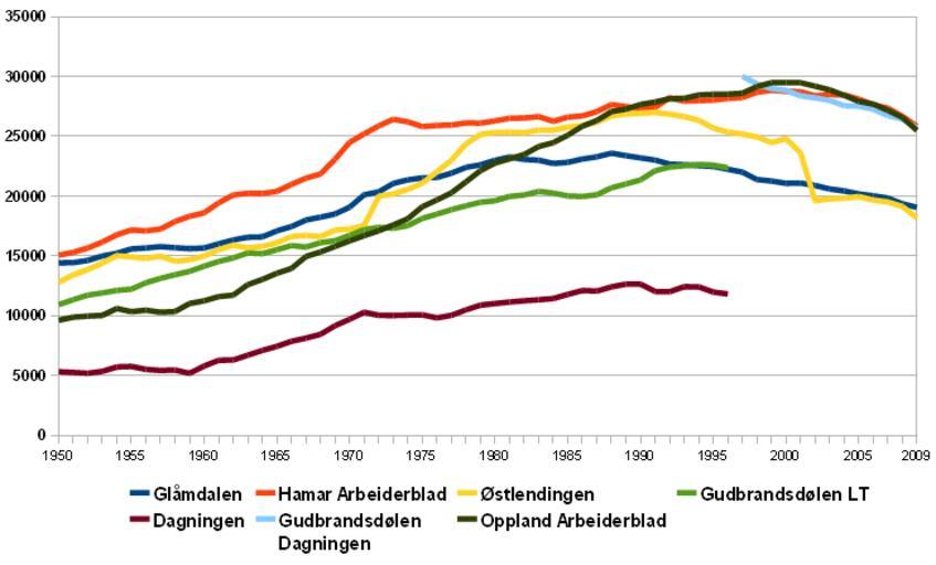 | Keywords: Innlandsavisenes opplagstall 1950-2009.png en Graph showing the inland newspapers circulation from 1950 to 2009 Based on http //www mediebedriftene no/index asp id 78404 http //www mediebedriftene no/index asp id 78404 no Graf som viser de fem før seks største innlandsavisene opplagstall fra 1950 til 2009 Tallene er basert på http //www mediebedriftene no/index asp id 78404 Mediebedriftenes Landsforening Avisene er fra Hedmark Glåmdalen Kongsvinger Hamar Arbeiderblad Hamar Østlendingen Elverum Oppland Gudbrandsølen Lillehammer Tidende Lillehammer Dagningen Lillehammer Gudbrandsølen Dagningen Lillehammer Oppland Arbeiderblad Gjøvik Own Torstein Frogner 2010-04-28 Hedmark Oppland |