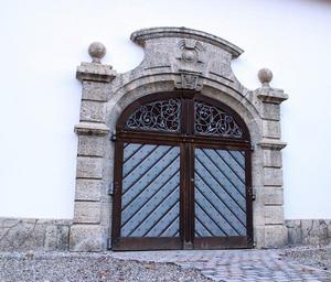 Keywords: input hinged door double door round arch door wood wood doors house entrance goal metal fitting ancient times middle ages stone column access old architectural style historically