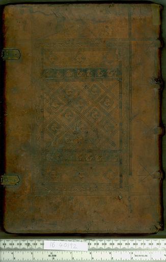 | Keywords: Institutiones - Lower cover (IB40192).jpg Style Panel design Single tools design Diaper; Caption Lower cover; Colour Brown; Edge Unspecified exhibition history Decorative Technique Tooled in blind; Cover Material Calf Cushioned wooden boards sewn on 4 leather sewing supports Remains of two clasps catching onto lower board Extensive ink ms notes Vellum paste downs not pasted down lower one has a hole in it BMC VIII 146 H 9529 GW 7631 Belonged to Master John Willoughby object history Text 1493 / 1494; Paris; Unspecified object type Cc-zero place of creation Binding England place of discovery Graham Pollard The names of some fifteenth century English binders in The Library Volume s5-XXV Number 3 1970 See H M Nixon Five Centuries of English Bookbinding London 1978 n 3 See J B Oldham English Blind-Stamped Bindings Cambridge 1952 pls XVI XVIII British Library image http //www bl uk/catalogues/bookbindings/LargeImage aspx RecordId 020-000014713 ImageId ImageId 54062 Copyright BL Institutiones Uploaded with GWToolset Institutiones - Lower cover IB40192 http //www webarchive org uk/bldatasets/bindings/ib40192L jpg Bookbinding 15th-century bookbinding British Library Bookbindings Scanned with HP ScanJet 8200 |