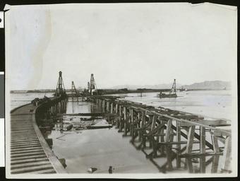 Keywords: Intake pier in the Salton Sea, eight mile below Yuma, (s.d.) (CHS-46399).jpg Salton Sea in Southern California Although the title reads eight mile below Yuma the south-eastern shore of Salton Sea is about 140 miles northwest of Yuma AZ ”in Imperial County CA A wooden walkway stands in the water on the left with the skeletal wooden pier standing parallel on the right Logs and discarded debris float on the surface of the water between them and boxes are piled on the walkway further back Three towers stand at their ends along a dirt hill which extends through the water across the background A fourth tower stands on a small dock in the water on the right with a large lightly-colored structure on the coast behind it Photographer James George Wharton Filename CHS-46399 Subject file heading Natural features -- Rivers -- Colorado River Part of collection California Historical Society Collection 1860-1960 Type images Part of subcollection Title Insurance and Trust and C C Pierce Photography Collection 1860-1960 Repository name USC Libraries Special Collections Accession number 46399 Archival file chs_Volume145/CHS-46399 tiff Coverage era s d Repository address Doheny Memorial Library Los Angeles CA 90089-0189 Subject adlf piers Geographic subject country USA Format aacr2 1 photograph photoprint b w ; 16 x 21cm Rights Digitally reproduced by the USC Digital Library; From the California Historical Society Collection at the University of Southern California Call number CHS-46399 Project USC Repository email specol usc edu Contributing entity California Historical Society Publisher of the digital version University of Southern California Libraries Format aat photographic prints; photographs Geographic subject state California Legacy record ID chs-m20985; USC-1-1-1-14306 Access conditions Send requests to address or e-mail given Phone 213 821-2366; fax 213 740-2343 Geographic subject lakes Salton Sea Subject lcsh Mines and mineral resources 1923 George Wharton James 1858 1923 http //digitallibrary usc edu/cdm/ref/collection/p15799coll65/id/25098 PD-old-70-1923 Salton Sea Piers in California Black and white photographs of California Images from USC Digital Library uploaded by Fæ Photographs by George Wharton James California Historical Society Collection 1860-1960 |