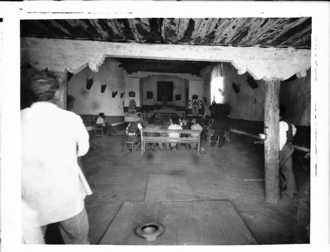 | Keywords: Interior of the church at Cibolleta, New Mexico, during services, ca.1898 (CHS-3913).jpg en <br> Interior of the church at Cibolleta New Mexico during services ca 1898 Photograph of the interior of the church at Cibolleta New Mexico during services ca 1898 About twenty people sit in benches and chairs arranged in a small square in the middle of the room The altar is visible in an alcove behind a ballustrade at the far wall Pictures hang from all the walls One man stands near a thick wood pillar at right Another man stands in the foreground at left beside a wooden table center on which a hat sits The rafters are bare Call number CHS-3913 Photographer James George Wharton Filename CHS-3913 Coverage date circa 1898 Part of collection California Historical Society Collection 1860-1960 Format glass plate negatives Type images Geographic subject city or populated place Cibolleta Repository name USC Libraries Special Collections Accession number 3913 Microfiche number 1-179- Archival file chs_Volume96/CHS-3913 tiff Part of subcollection Title Insurance and Trust and C C Pierce Photography Collection 1860-1960 Repository address Doheny Memorial Library Los Angeles CA 90089-0189 Geographic subject country USA Format aacr2 3 photographs glass photonegative photoprints b w ; 17 x 22 cm 21 x 26 cm Rights Digitally reproduced by the USC Digital Library; From the California Historical Society Collection at the University of Southern California Subject adlf religious facilities Project USC Repository email specol usc edu Contributing entity California Historical Society Date created circa 1898 Publisher of the digital version University of Southern California Libraries Format aat photographic prints; photographs Geographic subject state New Mexico Legacy record ID chs-m16455; USC-1-1-1-13971 Access conditions Send requests to address or e-mail given Phone 213 821-2366; fax 213 740-2343 Subject file heading Indians -- Pueblo -- Pueblo villages New Mexico Subject lcsh Indians of North America circa 1898 date created George Wharton James 1858 1923 http //digitallibrary usc edu/cdm/ref/collection/p15799coll65/id/16394 PD-old-70-1923 Images from USC Digital Library uploaded by Fæ Photographs by George Wharton James California Historical Society Collection 1860-1960 Glass plate negatives |