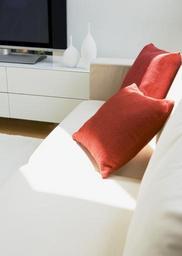 Keywords: white carpet couch sofa leather red pillow modern room nobody copy dwelling contemporary light concrete cozy wall furniture interior settee inside home house stylish background space residence comfortable indoors
