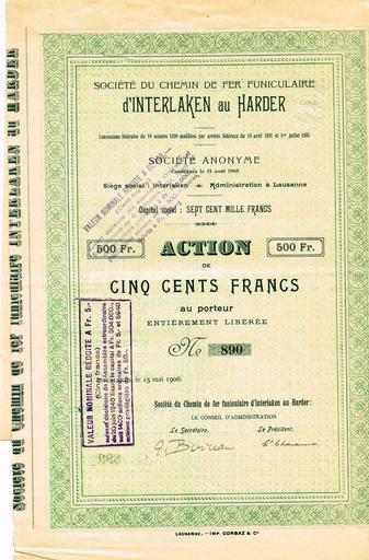 | Keywords: Interlaken Harder 1906.jpg en Share of the Société du Chemin de fer funiculaire d'Interlaken au Harder issued 15 May 1906 de Aktie über 500 Francs der Société du Chemin de fer funiculaire d'Interlaken au Harder vom 15 Mai 1906; Auflage 1'400 Stück Am 6 September 1923 Nennwertreduktion auf 100 Franken am 20 April 1940 auf 5 Franken Heute noch als Stammaktie gültig Die Konzession zum Bau dieser Bahn wurde am 10 Oktober 1890 erteilt die AG erst am 31 August 1905 gegründet Sammlung eines Mitglieds des Ersten Deutschen Historic-Actien-Clubs e V EDHAC e V ; kl Unbekannte Autoren und Grafiker; Scan vom EDHAC e V 1906-05-15 PD-old-70-1923 Bonds and Shares of EDHAC members Harderbahn |