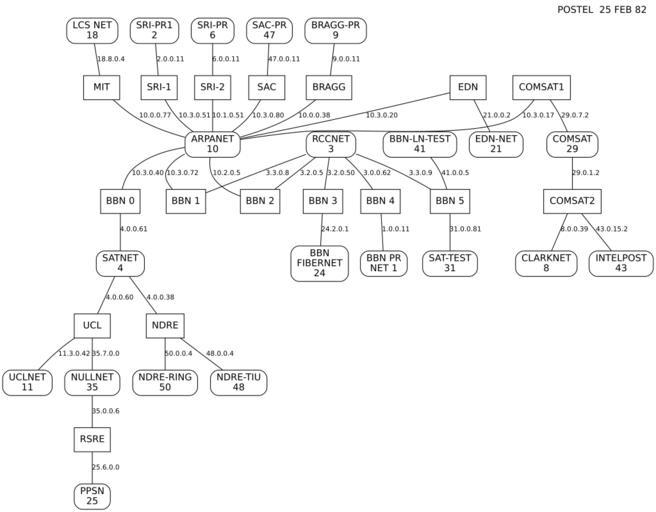 | Keywords: Internet82.svg Contemporary map of the entire Internet in semi-production phase many hosts attached to the ARPANET were still using NCP at this point in February 1982 The ovals are sites/networks some sites included more than one physical network the rectangles are individual routers No individual hosts are shown Drawn by Jon Postel of the Information Sciences Institute under a DARPA research contract as part of Internet development Eine Zeitgenössische Entwurfsansicht des gesamten Internets im Februar 1982 Die Ovale bezeichnen Sites/Netzwerke einige bestehen dabei aus mehreren Physikalischen Netzwerken die Rechtecke stellen individuelle Router dar einzelne Hosts werden nicht dargestellt Gezeichnet von Jon Postel vom Information Sciences Institute unter dem DARPA research contract als Teil der Internet Entwicklung Mapa contemporáneo de Internet en fase de semi-producción varios hosts unidos a ARPANET cuando aún se usaba el NCP en Febrero de 1982 Los óvalos son sitios/conexiones algunos sitios incluÃan más de una conexión fÃsica los rectángulos son routers individuales No se muestran los hosts individuales Dibujado por Jon Postel del Instituto de Ciencias de la Computación bajo un contrato de investigación como parte del desarrollo de Internet Vue schématique d ™Internet alors en phase de semi-production datant de février 1982 A cette époque NCP était encore largement utilisé par les systèmes connectés à ARPANET Les ovales représentent des sites ou réseaux certains sites étant constitués de plusieurs réseaux physiques alors que les rectangles identifient les routeurs Les ordinateurs hôtes ne sont pas représentés Dessiné par Jon Postel en poste à l ™Institut des sciences informatiques Information Sciences Institute au sein de l ™Université de Californie du Sud contribuant au développement d ™Internet dans le cadre d ™un contrat de recherche de la DARPA Rappresentazione della rete internet nel febbraio 1982 Gli ovali rappresentano siti/reti alcune costituite da più reti fisiche mentre i rettangoli sono i singoli router I singoli host non sono rappresentati Disegno realizzato da Jon Postel nell'ambito di un programma di ricerca della DARPA sullo sviluppo di internet Information Sciences Institute Instituto de Ciencias de la Computación Universidad del Sur de California Institut des sciences informatiques Information Sciences Institute établissement de l ™Université de Californie du Sud Uploaded to English Wikipedia on 30th August 2005 by Jnc from English Wikipedia ” uploaded to Commons on 17th February 2006 by Nethac DIU from Spanish Wikipedia Renamed on Saturday 29 July 2006 Hochgeladen in das Englische Wikipedia am 30 August 2005 von Jnc vom Englischen Wikipedia ” Bei Commons hochgeladen am 17 Februar 2006 von Nethac DIU aus dem Spanischen Wikipedia Umbenannt am Samstag den 29 Juli 2006 Subido a la Wikipedia inglesa en 30 de Agosto de 2005 por Jnc de la Wikipedia Inglesa; subida a Commons el 17 de Febrero de 2006 por Nethac DIU de la Wikipedia Española Renombrada el sábado 29 de julio de 2006 Ajouté à la version anglaise de Wikipedia le 30 août 2005 par Jnc Wikipedia en anglais Ajouté aux Commons le 17 février 2006 par Nethac DIU Wikipedia en espagnol Renommé le 29 juillet 2006 Jon Postel converted to SVG using Graphviz by Pitel PD-USGov-Military 200px 200px Created with Graphviz PD-USGov Graphviz source <source lang dot >graph Internet82 graph overlap compress sep 1 label POSTEL 25 FEB 82 fontname sans-serif labelloc t labeljust r bgcolor transparent edge fontsize 10 fontname sans-serif node shape box bgcolor blue fontname sans-serif SRI1 label SRI-1 SRI2 label SRI-2 SAC BRAGG MIT EDN COMSAT1 COMSAT2 BBN2 label BBN 2 BBN1 label BBN 1 BBN0 label BBN 0 BBN3 label BBN 3 BBN4 label BBN 4 BBN5 label BBN 5 UCL NDRE RSRE node style rounded ARPANET label ARPANET\n10 SRIPR1 label SRI-PR1\n2 SRIPR2 label SRI-PR\n6 SACPR label SAC-PR\n47 BRAGGPR label BRAGG-PR\n9 LCSNET label LCS NET\n18 EDNNET label EDN-NET\n21 COMSAT29 label COMSAT\n29 CLARKNET label CLARKNET\n8 INTELPOST label INTELPOST\n43 RCCNET label RCCNET\n3 SATTEST label SAT-TEST\n31 BBNLNTEST label BBN-LN-TEST\n41 BBNPRNET label BBN PR\nNET 1 BBNFIBERNET label BBN\nFIBERNET\n24 SATNET label SATNET\n4 NDRERING label NDRE-RING\n50 NDRETIU label NDRE-TIU\n48 UCLNET label UCLNET\n11 NULLNET label NULLNET\n35 PPSN label PPSN\n25 SRIPR1 -- SRI1 label 2 0 0 11 SRI1 -- ARPANET label 10 3 0 51 SRIPR2 -- SRI2 label 6 0 0 11 SRI2 -- ARPANET label 10 1 0 51 SACPR -- SAC label 47 0 0 11 SAC -- ARPANET label 10 3 0 80 BRAGGPR -- BRAGG label 9 0 0 11 BRAGG -- ARPANET label 10 0 0 38 MIT -- ARPANET label 10 0 0 77 LCSNET -- MIT label 18 8 0 4 EDN -- EDNNET label 21 0 0 2 EDN -- ARPANET label 10 3 0 20 COMSAT1 -- ARPANET label 10 3 0 17 COMSAT1 -- COMSAT29 label 29 0 7 2 COMSAT29 -- COMSAT2 label 29 0 1 2 COMSAT2 -- CLARKNET label 8 0 0 39 COMSAT2 -- INTELPOST label 43 0 15 2 ARPANET -- BBN0 label 10 3 0 40 ARPANET -- BBN1 label 10 3 0 72 ARPANET -- BBN2 label 10 2 0 5 RCCNET -- BBN1 label 3 3 0 8 RCCNET -- BBN2 label 3 2 0 5 RCCNET -- BBN3 label 3 2 0 50 RCCNET -- BBN4 label 3 0 0 62 RCCNET -- BBN5 label 3 3 0 9 BBN5 -- SATTEST label 31 0 0 81 BBNLNTEST -- BBN5 label 41 0 0 5 BBN4 -- BBNPRNET label 1 0 0 11 BBN3 -- BBNFIBERNET label 24 2 0 1 BBN0 -- SATNET label 4 0 0 61 SATNET -- UCL label 4 0 0 60 SATNET -- NDRE label 4 0 0 38 NDRE -- NDRERING label 50 0 0 4 NDRE -- NDRETIU label 48 0 0 4 UCL -- UCLNET label 11 3 0 42 UCL -- NULLNET label 35 7 0 0 NULLNET -- RSRE label 35 0 0 6 RSRE -- PPSN label 25 6 0 0 </source> Images with Graphviz source code ARPANET Internet BBN |