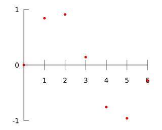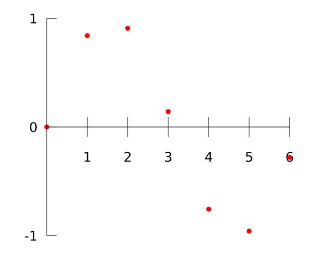 | Keywords: Interpolation Data.svg Data points to be used in the interpolation article various interpolation methods are applied to this data set in that article self-made in Gnuplot 2007-06-26 Berland Based on original PNG-version by User Jitse Niesen with gnuplot source code and svg-version by User Cronholm144 Gnuplot source code set terminal svg fname Vera fsize 25 set output Interpolation_Data svg set key off set xzeroaxis set xtics axis 1 1 set ytics nomirror 1 set border 2 plot - with points pointtype 7 pointsize 0 5 \ 0 with lines linetype -1 linewidth 1 0 0 1 0 8415 2 0 9093 3 0 1411 4 -0 7568 5 -0 9589 6 -0 2794 e Interpolation |