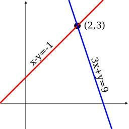 Keywords: Intersecting Lines.svg The graphs of the linear equations x y 1 and 3x + y 9 The two lines intersect at the point 2 3 which is the unique solution for the system of equations <br> NB A minus sign is missing on the red curve in the figure Own Jim belk Ult Krishnavedala ElectroKid ¢ Krishnavedala contribs cc Inkscape V 0301 Linear equations |