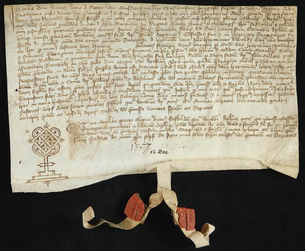 | Keywords: Intyg på betalda avgifter för biskopsutnämning - Svenskt Diplomatarium - 7276.jpg sv Den påvlige notarien Nicolaus Petri präst från Roskilde upprättar i Skänninge ett notarialinstrument Längst ned till vänster har notarien satt sitt särskilda märke för att äktheten ska kunna styrkas Intyget omtalar att 40 mark har mottagits av en påvlig nuntie som betalning för de avgifter biskop Magnus av Västerås var skyldig att erlägga till en påvliga kurian efter att han fått sin utnämning till biskop 1357-12-12 Institution National Archives of Sweden Dipl_7276 Svenskt Diplomatariums huvudkartotek nr 7276 Nicolaus Petri påvlig notarie Copyright information PD-old-100 PermissionOTRS 2014022510019369 Riksarkivet Sverige Riksarkivet cooperation project cc-by-sa-3 0 Swedish Medieval Charters by the National Archives of Sweden 1357 documents 1300s works in Sweden Seals of Sweden Uploaded with UploadWizard |