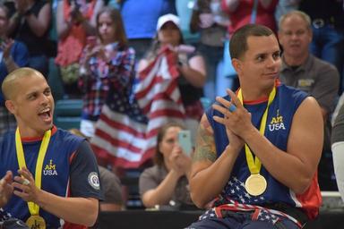 | Keywords: Invictus Games 2016, Wheelchair Basketball 160512-N-WW503-568.jpg en Navy wounded warrior teammates Fire Controlman 3rd Class ret Jason Reyes and Chief Yeoman ret Javier D Rodriguez Santiago share a laugh after the U S team wins the gold medal in wheelchair basketball May 12 2016 in Orlando Fla The Invictus Games is an international adaptive sports competition for wounded ill and injured Service members and veterans U S Navy photo by Lt j g Marissa A Cruz/Released <br>Unit Commander Navy Installations Command 2016-05-12 Lt j g Marissa Cruz https //www dvidshub net/image/2600697/invictus-games-2016-wheelchair-basketball 160512-N-WW503-568 2016-05-19 19 28 FL US PD-USGov-Military-Navy 2016 Invictus Games Images from DoD uploaded by Fæ |
