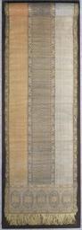 Keywords: Iranian - Sash with Small Male Figures - Walters 8314 - Top Detail.jpg This long sash would have been folded lengthwide and wrapped many times around its wearer's outer robe The decoration of the narrow bands running along the top bottom and middle includes small male figures in the style of contemporary miniature painting century 17 18 gold and silver brocade cm 459 59 4 accession number 83 14 24129 Dikran Kelekian New York and Paris Henry Walters Baltimore date of acquisition unknown by purchase Walters Art Museum Henry Walters Acquired by Henry Walters The Arts of Persia 1949 place of origin Iran Walters Art Museum license Textiles in the Walters Art Museum Islamic art in the Walters Art Museum Textiles of Iran Sashes |