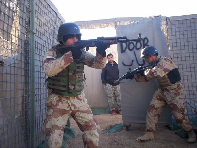 | Keywords: Iraqi Army Soldiers Taught 'Warrior Ethos' by Black Dragons DVIDS35284.jpg en Iraqi Army students at the joint Iraqi and 4th Brigade Combat Team 1st Cavalry Division NCO Academy at Q-West Base Complex Iraq demonstrate close-quarters battle drills and room clearing Jan 22 U S Army photo by Sgt David Gilmore Joint NCO Academy Administrative Officer 4th Brigade Combat Team 1st Cavalry Division 2007-01-29 https //www dvidshub net/image/35284 35284 2007-01-29 12 11 CONTINGENCY OPERATING BASE Q-WEST IQ PD-USGov Army of Iraq post-2003 Images from DoD uploaded by Fæ |