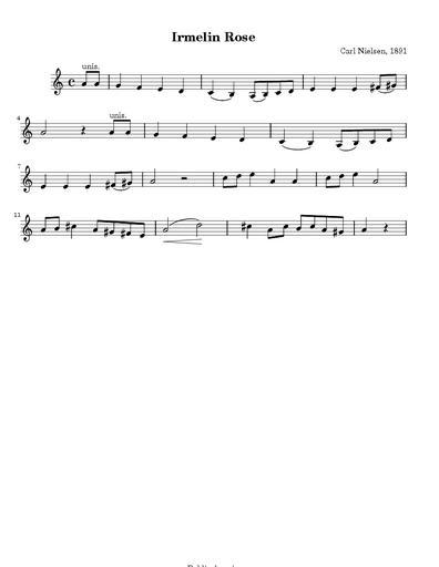 | Keywords: Irmelin Rose.png Danish song composed by Carl Nielsen with text by J P Jacobson Lilypond <pre> <nowiki> include deutsch ly \version 2 6 4-5 \header title Irmelin Rose composer Carl Nielsen 1891 copyright Public domain melody \clef treble \time 4/4 \key a \minor \relative c' \partial 4 a'8 \markup unis a upbeat g4 f e d 1 c h a8 h c d 2 e4 e e fis8 gis \break 3 a2 r4 a8 \markup unis a 4 g4 f e d 5 c h a8 h c d \break 6 e4 e e fis8 gis 7 a2 r2 8 c8 d e4 a a 9 c8 d e4 a 2 \break 10 a8 h cis4 a8 gis fis e 11 a2 d 12 cis4 a8 cis h cis a gis 13 a4 r4 \bar 14 \score \new Staff \melody </nowiki> </pre> Also See Irmelin_Rose mid Find midi here Violin for beginners thumb 250px left Music Sheet <br style clear both; > PD-old Music of Denmark Compositions by Carl Nielsen |