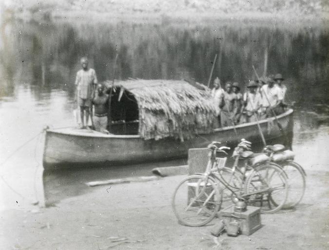 MAKE A MEME View Large Image Iron boat, cycles etc. en route Ngombe, Congo, ca. 1900-1915 (IMP-CSCNWW33-OS12-4).jpg en Iron boat cycles etc en route Ngombe Congo ca 1900-1915 Black and white lantern slide showing an iron boat with a thatched canopy Ten Congolese men ...
