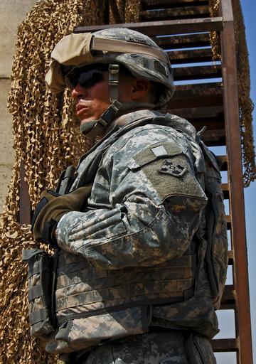 | Keywords: Iron Eagle guards keep Soldiers safe, protect force DVIDS112979.jpg en Sgt Carlos Torres area defense sergeant of the guard Combat Aviation Brigade 4th Infantry Division Multi-National Division - Baghdad observes perimeter security from the base of a guard tower on Camp Taji Sept 4 2008 As sergeant of the guard Torres is responsible for ensuring all of the CAB's assigned guards have the necessary equipment to perform the duties necessary for protecting the brigade's Soldiers and aviation assets from enemy attacks Torres is a native of Puerto Rico 2008-09-04 Spc Jason Dangel https //www dvidshub net/image/112979 112979 2008-09-04 12 11 TAJI IQ PD-USGov Camp Taji Images from DoD uploaded by Fæ |