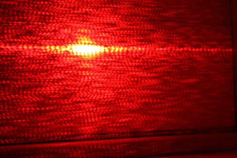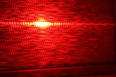 | Keywords: Irregular interference pattern.JPG  en An irregular interference pattern that was obtained shining a laser on a homemade double slit made from 375 mm copper wire projected onto a wall approximately 7 meters apart de Ein unregelmäßiges Interferenzmuster an einem aus 0 375 mm dicken Kupferdraht gefertigten hausgemachten Doppelspalt projiziert auf eine etwa 7 Meter entfernte Wand es Un patrón de interferencias irregular obtenido dividiendo un rayo láser con un alambre de 0 375 mm de diámetro 2016-02-03 23 35 09 own Gapcf other versions cc-zero Interference patterns |