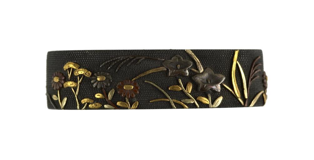 | Keywords: Ishiguro Masatsune II - Fuchi with Autumn Flowers - Walters 511064.jpg The fuchi is decorated with flowers emblematic of autumn pampas grass Chinese bellflower chrysanthemum and mist flower This is part of a set with Walters 51 1065 ca 1800 1850 late Edo shakudo copper silver gold cm 3 7 accession number 51 1064 16608 William T / Henry Walters Collection Baltimore date and mode of acquisition unknown Walters Art Museum Henry Walters Acquired by William T or Henry Walters Signature Ishiguro Moritsune horu; Translation Carved by Ishiguro Moritsune place of origin Edo present-day Tokyo Japan Walters Art Museum license Fuchi in the Walters Art Museum Ishiguro Masatsune II Media contributed by the Walters Art Museum needs category review |