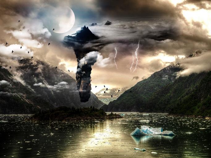 Keywords: island sky mountains lake clouds mystical fantastic ice birds flash thunder thunderstorm forward pending mount thundercloud mirroring moon sun star water sea nature