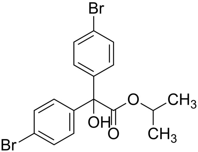 | Keywords: Isopropyl 2,2-bis(4-bromophenyl)-2-hydroxyacetate 200.svg validSVG Structure of isopropyl 2 2-bis 4-bromophenyl -2-hydroxyacetate Own 2014-06-09 Emeldir <span class signature-talk ></span> Chemical structure verified https //upload wikimedia org/wikipedia/commons/8/8d/Isopropyl_2 2C2-bis 284-bromophenyl 29-2-hydroxyacetate_200 svg 1S/C17H16Br2O3/c1-11 2 22-16 20 17 21 12-3-7-14 18 8-4-12 13-5-9-15 19 10-6-13/h3-11 21H 1-2H3 FOANIXZHAMJWOI-UHFFFAOYSA-N 18181-80-1 Synonyms <small>1-methylethyl 4-bromo-alpha- 4-bromophenyl -alpha-hydroxybenzeneacetate 1-Methylethyl 4-bromo-alpha- 4-bromophenyl -alpha-hydroxybenzeneacetate 4-Bromo-alpha- 4-bromophenyl -alpha-hydroxybenzeneacetic acid 1-methylethyl ester Acarol Acarol R Bis- 4-bromo-phenyl -hydroxy-acetic acid isopropyl ester bromopropylate Bromopropylate ENY 27552 Folbex VA GS-19851 Isopropyl 2 2-bis 4-bromophenyl -2-hydroxyacetate Isopropyl 4 4'-dibromobenzilate Isopropyl dibromobenzilate Methylethyl 4-bromo-alpha- 4-bromophenyl -alpha-hydroxybenzeneacetate Neoron Neoron R Phenisobromolate</small> PD-chem Bromobenzenes Diphenylmethanols Carboxylate esters Isopropyl esters Acaricides |