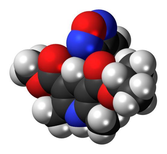 | Keywords: Isradipine-3D-spacefill.png Space-filling model of the isradipine molecule a calcium channel blocker Colour code 505050 Carbon C black<br> F0F0F0 Hydrogen H white<br> F51E1E Oxygen O red<br> 3C50FA Nitrogen N blue<br> 2011-06-13 own DS Visualizer Jynto talk Ball-and-stick version cc-zero Images by Jynto Space-filling models Isradipine |