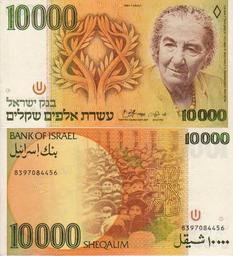 | Keywords: Israel 10000 NIS Bill 1984.jpg  en Israel 10 000 old sheqel banknote 1984 It was replaced with a 10 new sheqel banknote with identical design in 1985 Both notes are out of circulation today The note features a portrait of Golda Meir and the crowd of Russian Jews welcoming her as the first Israeli ambassador to the Soviet Union with the inscription shaláħ et ʻamí Let my people go Exodus 9 1 Israël - un billet de banque de 10 000 Sheqalim datant de 1984 qui n'est plus en usage avec un portrait de Golda Meir et une inscription ש ח את עמי Exode 9 1 Laisse aller mon peuple he שטר מישרא ש 10 000 שק ישן משנת 1984 הוח ף בשטר ש 10 שק י חדשי בעיצוב זהה בשנת 1985 שני השטרות אינ במחזור היו ע השטר מופיע דיוקנה ש גו דה ומאיר וקב ת הפני שערכו  ה יהודי רוסיה כשהגיעה  ברית המועצות כשגרירת ישרא הראשונה ע הכתובת שַ ּח את עמי שמות ט' א' ورقة نقدية إسرائيلية من فئة 10000 شيقل قديم تحمل صورة جولدا مائير تم استبدال هذه الورقة بورقة نقدية من فئة 10 شواقل جديدة ذات تصميم متجانس في 1985، وقد خرجت كلتا الورقتين من حيز التداول يحمل ظهر الورقة النقدية صورة احتشاد يهود روسيا لاستقبال جولدا مائير عند وصولها إلى الاتحاد السوفياتي كسفيرة إسرائيل الأولى لديه، مع اقتباس بالعبرية من سفر الخروج أصحاح 9، 1 شالاح إت عامي أطلق شعبي own scan User To14go 2009-01-23 Money-IL <gallery> Golda Meir Moscow 1948 jpg The photograph used on the reverse </gallery> Old Israeli shekel banknotes Persons on banknotes 1984 in Israel Banknotes with a face value of 10000 |