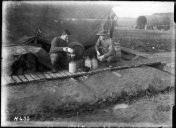 | Keywords: blackandwhite monochrome outdoor photo border black and white Soldiers pouring rum from a barrel into ceramic flagons for issue to troops in the front trenches during World War I. Photograph taken Dickebusch 2 February 1918 by Henry Armytage Sanders. Inscriptions: Inscribed - Photographer's title on negative -bottom left: H433. Quantity: 1 b&w original negative(s). Physical Description: Dry plate glass negative 4.75 x 6.5 inches    Issuing the rum ration to troops in the front trenches, World War I. Royal New Zealand Returned and Services' Association :New Zealand official negatives, World War 1914-1918. Ref: 1/2-013056-G. Alexander Turnbull Library, Wellington, New Zealand. natlib.govt.nz/records/22534861 Soldiers pouring rum from a barrel into ceramic flagons for issue to troops in the front trenches during World War I. Photograph taken Dickebusch 2 February 1918 by Henry Armytage Sanders. Inscriptions: Inscribed - Photographer's title on negative -bottom left: H433. Quantity: 1 b&w original negative(s). Physical Description: Dry plate glass negative 4.75 x 6.5 inches    Issuing the rum ration to troops in the front trenches, World War I. Royal New Zealand Returned and Services' Association :New Zealand official negatives, World War 1914-1918. Ref: 1/2-013056-G. Alexander Turnbull Library, Wellington, New Zealand. natlib.govt.nz/records/22534861 |