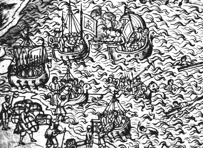 Keywords: IstSib003 2.jpg Лодейное с ажение на Волге Исто ия Сиби ская ультимедиа Цент ГУ http //www mmedia nsu ru/vbook/vbook/obj8/MINIATURES htm 1697 - 1703 С У Ремезов Author died more than 70 years ago - public domain PD-old Remezov Chronicle