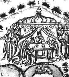 Keywords: IstSib047 1.jpg Кучум обсуждает с му зами чудесное видение Исто ия Сиби ская ультимедиа Цент ГУ http //www mmedia nsu ru/vbook/vbook/obj8/MINIATURES htm 1697 - 1703 С У Ремезов Author died more than 70 years ago - public domain PD-old Remezov Chronicle |