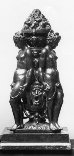 Keywords: Italian - Cover for an Incense Burner - Walters 5448.jpg This cover and its pair Walters 54 47 each with three nude young women--possibly the Three Graces--leaning against an urn were for incense burners The perfumed smoke was released through holes piercing the antique-style grotesque masks Many small bronzes had a utilitarian purpose; incense burners were a typical product of bronze casters from Padua However while the figures' proportions modeling and black patina are characteristic of Italian workmanship the elegant conception has much in common with works for the French court Perhaps the sculptor was an Italian working in France between 1570 1590 Renaissance bronze cm 36 8 accession number 54 48 33070 Henry Walters Baltimore date and mode of acquisition unknown Walters Art Museum Henry Walters Acquired by Henry Walters place of origin Paris France Walters Art Museum license Renaissance applied arts in the Walters Art Museum Italian art in the Walters Art Museum Statues of the Three Graces Media contributed by the Walters Art Museum needs category review |