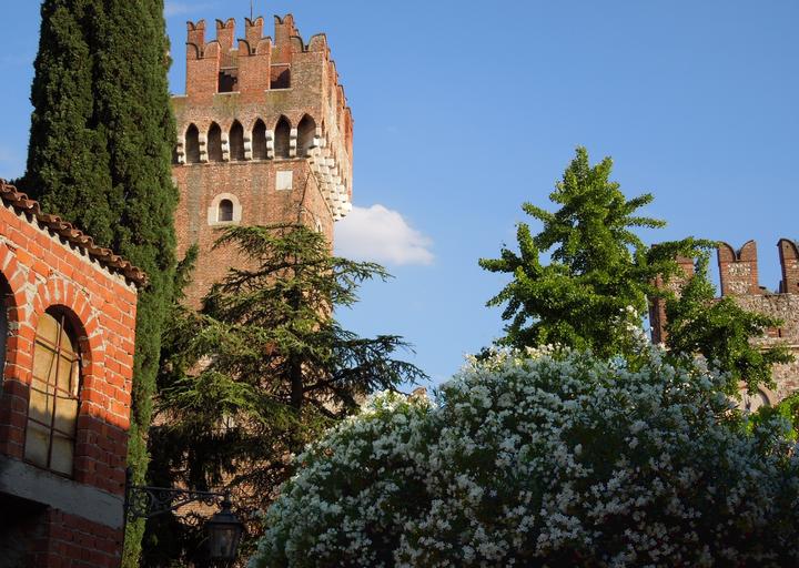 Keywords: italy castle rhododendron summer blue sky brick tower