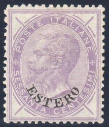 | Keywords: Italy Estero 1874 Sc10.jpg en Italy offices abroad King Victor Emmanuel II issue overprinted 'ESTERO' in black 60 centesimi lilac mint White wove paper with 'Imperial Crown' watermark Perforated 14 0 x 14 0 Typography printing by the Italian state printing offices in Turin Catalogue Sass 8 Sc 10 1874 Scan of original Government of Italy PD-old-100 PD-Italy 1874 stamps of Italy Stamps of Italian post offices abroad Overprints on stamps of Italy Purple stamps | ||||