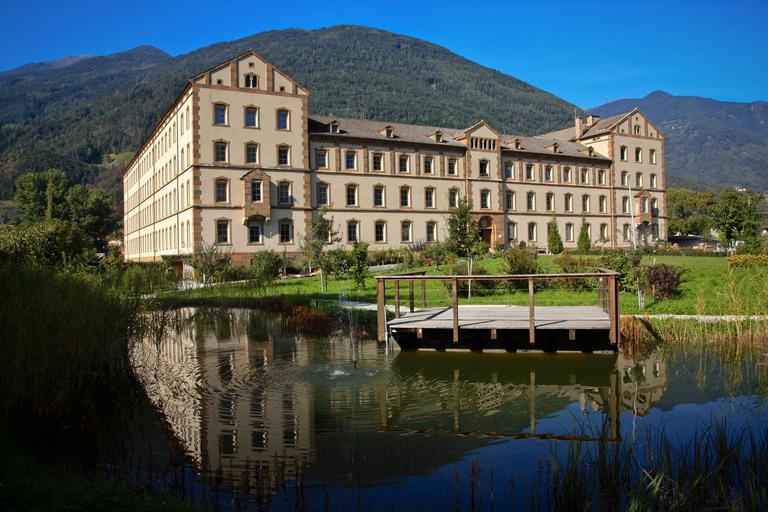 Keywords: italy vinzentinum hotel resort building structure mountain forest trees woods lake pond water reflections grass plants scenic summer spring nature outside