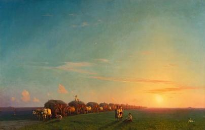 Keywords: ivan alvazovsky landscape painting art artistic artistry oil on canvas sky clouds trees nature outside scenic country countryside sunset wagons horse people wagon-train