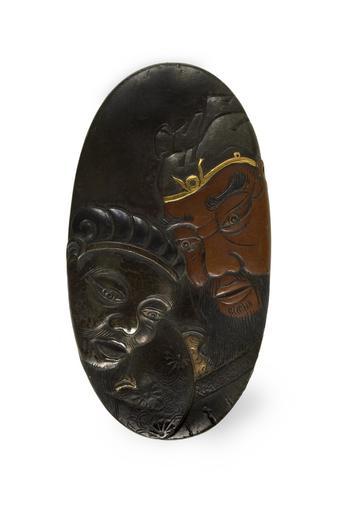 Keywords: Iwamoto Konkan - Kashira with the Chinese General Kanyu (Ch Guan Yu -Kuan Yu-) - Walters 51945.jpg The figure on the right is the 2nd-century Chinese general Kanyu Ch Guan Yu Kuan Yu He is accompanied by either his chief retainer Zhou Cang Chow Ts'ang or his son Kwan Bin Kwan Pin This is a part of a set with Walters 51 944 between 1744 1801 Edo shibuichi gold copper cm 3 3 l accession number 51 945 22412 William T / Henry Walters Collection Baltimore date and mode of acquisition unknown Walters Art Museum Henry Walters Acquired by William T or Henry Walters place of origin Edo present-day Tokyo Japan Walters Art Museum license Kashira in the Walters Art Museum Iwamoto Konkan Media contributed by the Walters Art Museum needs category review |