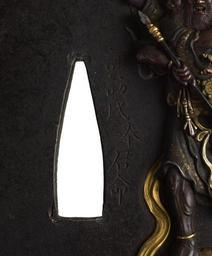 Keywords: Iwamoto Konkan - Tsuba with Marishiten - Walters 51253 - Mark B.jpg Standing on a charging bull at the right side of this tsuba is the Buddhist deity Marishiten She is known as the Queen of Heaven despite her masculine appearance She has three faces Her six arms normally eight carry a sword a bow and arrow and a spear She is believed to reside in the stars of Ursa Major The inscription on the front says that it was presented by the Suwa clan by orders of the ruler The Suwa clan controlled the area that is now Nagano prefecture The reverse has two Suwa oak leaf crests 1793 Edo iron silver gold copper shakudo cm 8 9 8 5 0 59 accession number 51 253 25631 Henry Walters Baltimore date and mode of acquisition unknown Walters Art Museum Henry Walters Acquired by Henry Walters Dedication Suwa uji tatematsuru kunmei; Date Kansei go mizu-no-to ushi toshi yƓfuku ; Signature kin ji sen Iwamoto Konkan; Translation Presented to the Suwa clan by orders of the ruler / Fifth year of Kansei 1793 the year of the ox November / Respectfully engraved by Iwamoto Konkan kao place of origin Edo present-day Tokyo Japan Walters Art Museum license Tsuba in the Walters Art Museum Iwamoto Konkan Media contributed by the Walters Art Museum needs category review |