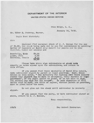 | Keywords: J.J. Duncan to Elmer B. Pomeroy, Farmer, Eagle Nest District. - NARA - 284661.tif Scope and content General notes 284661 Local identifier Department of the Interior Office of Indian Affairs Pine Ridge Agency 1878 - 09/17/1947 NARA's Central Plains Region Kansas City NREA 400 West Pershing Road Kansas City MO 64108 1915-01-18 Record group Record Group 75 Records of the Bureau of Indian Affairs 1793 - 1999 Record group ARC 404 Correspondence of the Day School Inspector J J Duncan compiled 02/09/1910 - 09/06/1916 Series ARC 283922 File unit Correspondence of Day School Inspector J J Duncan January 7 1915 to April 30 1915 01/07/1915 - 04/30/1915 File unit ARC 284642 Variant control numbers NAIL Control Number NRE-75-169-I-19 yes Other versions NARA-cooperation PD-USGov Documents related to Pine Ridge Indian Reservation |