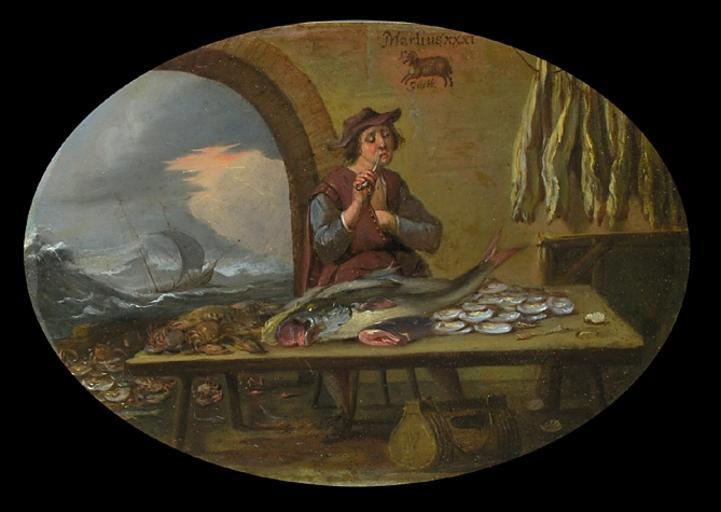 Keywords: J L Wouters Fishmonger.jpg oil copper http //www hampel-auctions com/ century 17 Jan Ludewick Wouters 1599-1663 PD-old-100 Jan Ludewick Wouters Fishmongers in art Paintings of markets 17th-century genre paintings Paintings of fish 17th-century oil on canvas paintings Portrait paintings of standing men Paintings of men at work Oval paintings Images from Hampel Auctions Hand on chest Location of museum or gallery missing