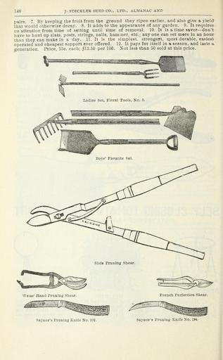 | Keywords: J. Steckler Seed Co., Ltd. garden manual 1900 (16547048556).jpg U6 <br> J STECEXER SEED CO I/TD ALMANAC ANI <br> pairs 7 Bv keeping the fruit from the ground they ripen earlier and also give a yield <br> that would otherwise decay 8 It adds to the appearance of any garden 9 It requires- <br> no attention from time of setting until lime of removal 10 It is a time saver ” don't <br> have to hunt up slats posts strings nails hammer etc ; any one can set more in an hour <br> than they can make in a day 11 It is the simplest strongest most durable easiest <br> operated and cheapest support ever offered 12 It pays for itself in a season and lasts a <br> veneration Price 15c each; 12 50 per 100 Not less than 50 sold at this price <br> Slide Pruning Shear <br> French Perfection Shear <br> Saynor's Pruning Knife No 192 <br> Saynora Pruning Knife No 194 43933700 150250 78709 Page 146 Text http //www biodiversitylibrary org/page/43933700 1900 10 5962/bhl title 78709 Henry G Gilbert Nursery and Seed Trade Catalog Collection ; J Steckler Seed Co Biodiversity Heritage Library J Steckler Seed Co Ltd garden manual 1900 dealers in vegetable flower field and grass seeds Garden Stories Catalogs Flowers Garden tools J Steckler Seed Co Seed industry and trade Seeds Trade catalogs Vegetables U S Department of Agriculture National Agricultural Library bhl page 43933700 dc identifier http //biodiversitylibrary org/page/43933700 bhlGardenStories BHLinbloom j steckler seed co u s department of agriculture national agricultural library bhlgardenstories bhlinbloom Information field Flickr posted date ISOdate 2015-02-18 CC-BY-2 0 BioDivLibrary https //flickr com/photos/61021753 N02/16547048556 2015-08-24 02 54 44 cc-by-2 0 PD-old-70-1923 J Steckler Seed Co Ltd garden manual 1900 Photos uploaded from Flickr by Fæ using a script |