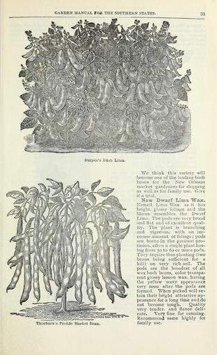 | Keywords: J. Steckler Seed Co., Ltd. garden manual 1900 (16571340211).jpg GARDEN MANUAL FOJt THE SOUTHERN STATES <br> Burpee's Busn Lima <br> Thorburn's ProlifiG Market Bean <br> We think this variety will <br> become one of the leading bush <br> beans for the New Orleans <br> market gardeners for shipping <br> as well as for family use Give <br> it a trial <br> New Bwarf X ima Wax <br> Named Lima Wax as it has <br> bright glossy foliage and the <br> bloom resembles the Dwarf <br> Lima The pods are very broad <br> and flat and of excellent qual- <br> ity The plant is branching <br> and vigorous with an im- <br> mense amount of foliage; pods <br> are borne in the greatest pro- <br> fusion often a single plant hav- <br> ing from 50 to 60 or more pods <br> They require thin planting two <br> beans being sufficient for a <br> hill on very rich soil The <br> pods are the broadest of all <br> wax bush beans color transpa- <br> rent glossy lemon wax having <br> the yellow waxy appearance <br> very soon after the pods are <br> formed When picked will re- <br> tain their bright attractive ap- <br> pearance for a long time and do <br> not become tough Quality <br> very tender and flavor deli- <br> cate Very fine for canning <br> Recommend same highly for <br> family use 43933600 150250 78709 Page 33 Text http //www biodiversitylibrary org/page/43933600 1900 10 5962/bhl title 78709 Henry G Gilbert Nursery and Seed Trade Catalog Collection ; J Steckler Seed Co Biodiversity Heritage Library J Steckler Seed Co Ltd garden manual 1900 dealers in vegetable flower field and grass seeds Garden Stories Catalogs J Steckler Seed Co Seed industry and trade Seeds Trade catalogs Vegetables U S Department of Agriculture National Agricultural Library bhl page 43933600 dc identifier http //biodiversitylibrary org/page/43933600 bhlGardenStories Lima Bean BHLinbloom j steckler seed co u s department of agriculture national agricultural library bhlgardenstories lima bean bhlinbloom Information field Flickr posted date ISOdate 2015-02-18 CC-BY-2 0 BioDivLibrary https //flickr com/photos/61021753 N02/16571340211 2015-08-24 02 52 57 cc-by-2 0 PD-old-70-1923 J Steckler Seed Co Ltd garden manual 1900 Photos uploaded from Flickr by Fæ using a script |
