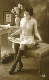Keywords: JA-Serie-0117 French postcard-number1.jpg en Early 20th-century French postcard labelled JA Serie 0117 with a woman posed in early twentieth century lingerie black stockings and a loose white slip which has slipped off the shoulders sitting and looking at some kind of art prints For related photos using the same stool/hassock see File JA-Serie-096_French_postcard-number1 jpg File JA-Serie-096_French_postcard-number2 jpg http //www edwardian-delights com/salesglp htm www edwardian-delights com between 1910 1917 Creator Jean Agélou PD by age <gallery>Image Agelou19 jpg</gallery> PD-old-auto-1923 1921 Jean Agélou Postcards of nude women in France Black and white photographs of topless women |