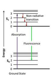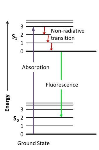 | Keywords: Jablonski Diagram of Fluorescence Only.png en Jablonski diagram of absorbance non-radiative decay and fluorescence 2012-04-22 own Jacobkhed Electronic transitions are about 1 eV Vibrational transitions are about 0 1 eV Rotational transitions not shown are about 0 001 eV Absorption is about 1 femptosecond relaxation takes about 1 picosecond fluorescence takes about 1 nanosecond S<sub>0</sub> and S<sub>1</sub> represent different electronic states The other numbers here 0 “3 are shown represent vibrational states cc-zero Uploaded with UploadWizard Fluorescence Jablonski Diagram |