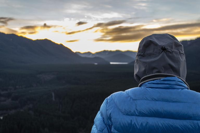 Keywords: jacket hood mountains hills valleys field sunset sky clouds cold outdoors nature landscape person