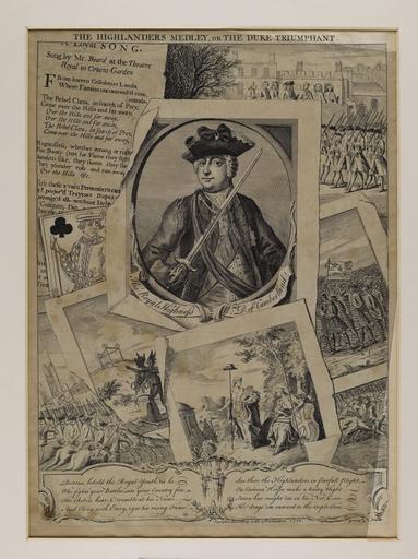 Keywords: Jacobite broadside - Highlanders Medley on The Duke Triumphant.jpg Oval portrait of Duke of Cumberland in centre surrounded by 7 scenes of battle classical figures and a picture of a devil and a playing card as well as a piece of printed material entitled The Loyal Song Sung by Mr Beard at the Theatre Royal in Covent Garden about the rebellious Highlanders With two columns of verse at bottom of entire sheet and Published according to Act of Parliament 1746 Price d 6 Size cm 0 0 exhibition history Institution National Library of Scotland Prints and broadsides object history object type PD-old-70-1923 place of creation Blaikie SNPG 75240236 Jacobite broadside - Highlanders Medley on The Duke Triumphant Uploaded with GWToolset Jacobite broadside - Highlanders Medley on The Duke Triumphant http //deriv nls uk/56YK98Q/7524/75240238 2 jpg Images uploaded as part of NLS-WMUK collaboration Jacobite broadsides |