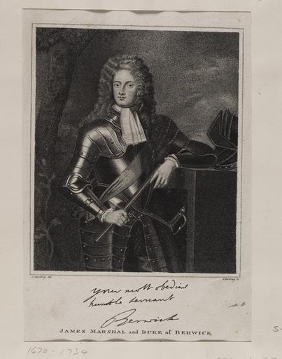 | Keywords: Jacobite broadside - James Fitzjames-Marshall, Duke of Berwick (1670-1734) Natural son of James II.jpg James Fitzjames/Marshall Duke of Berwick 1670-1734 Natural son of James II Size cm 15 15 exhibition history Institution National Library of Scotland Prints and broadsides object history object type PD-old-70-1923 place of creation Blaikie SNPG 75241820 Jacobite broadside - James Fitzjames/Marshall Duke of Berwick 1670-1734 Natural son of James II Uploaded with GWToolset Jacobite broadside - James Fitzjames/Marshall Duke of Berwick 1670-1734 Natural son of James II http //deriv nls uk/56YK98Q/7524/75241822 2 jpg Images uploaded as part of NLS-WMUK collaboration Jacobite broadsides |