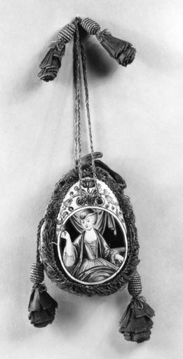 Keywords: Jacques Laudin II - Draw Purse - Walters 44184.jpg The sides of the purse are formed of two ovoid convex plaques On each is a central oval panel of black ground with a half-length figure one representing a young gentleman and the other a young lady The man wearing a wig and a breastplate over a doublet grasps the barrel if a musket The lady is seated proffering with her right hand a rose taken from a basket of roses on which her left hand rests She wears a riding hat adorned with a flower and a shawl or loose coat over her dress which is fashioned with a loosely laced bodice Her sleeves end in lace flounces Above the ovals sprays of tulips are pierced with four holes for the draw cords between 1663 1729 enamel on copper cream brocade silk silver gimp cm 7 7 5 2 accession number 44 184 24989 Leon Gruel Paris date and mode of acquisition unknown Henry Walters Baltimore date of acquisition unknown by purchase Walters Art Museum Henry Walters Acquired by Henry Walters place of origin Limoges France Walters Art Museum license Limoges painted enamels in the Walters Art Museum Media contributed by the Walters Art Museum needs category review Jacques Laudin II Limoges enamel - 17th century |